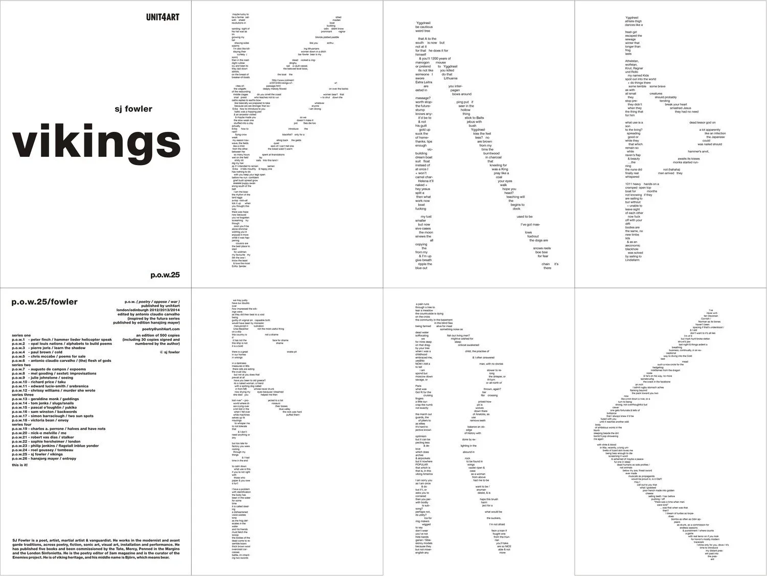 Out of print but available upon enquiry - A concrete poetry poster, edited by Antonio Claudio Carvalho. www.stevenjfowler.com/vikings From Chris McCabe “The penultimate p.o.w. takes us directly into the heart of visual language and does so through a challenging emotive language. vikings by s.j. fowler is an anachronistic Anglo-Saxon poem spelt out through runic images … This landscape of movement, uncertainty, lust and danger is propelled forwards through the compounded, a-syntactic language and the shifts in font type and size. The poem, it could be argued, represents a fierce and honest struggle with the self, although it concludes quite beautifully : "I shine only for you, dove / it's / time to introduce / my distant pres- / ent past into / the pres- / ent". More on the POW series http://chris-mccabe.blogspot.co.uk/2014/04/pow-final-series-perrone-melville-vas.html