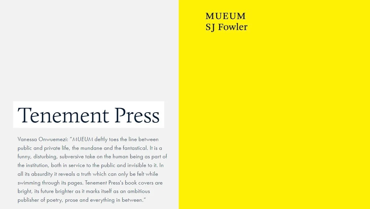 My debut fiction publication, a novella. Written originally while I was at work at the British Museum for a seven year stretch, with an excerpt shortlisted for the white review prize, now turned into a 150 page book, thanks to Tenement Press. https://tenementpress.com/M-U-E-U-M